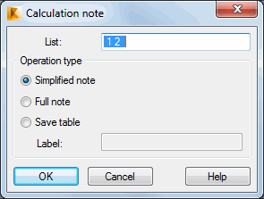 Use this dialog to select the type of calculation note to display.