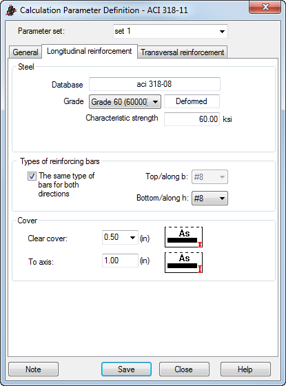 The Longitudinal reinforcement tab allows you to define the parameters of longitudinal reinforcement of an RC member according to the ACI 318 codes.