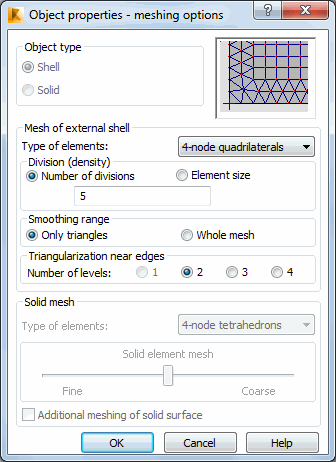 In either the Shell Design or Volumetric Structure Design modules, after you right-click an object and select Object Properties from the shortcut menu, you can define parameters for a planar or volumetric finite element mesh.