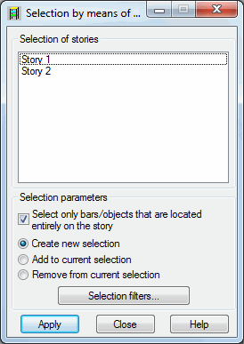 The top of the dialog lets you select structure elements using stories. These elements include: nodes, bars, objects, or finite elements.