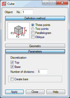 - Define the cube discretization parameters (the number of divisions in the suitable directions) and decide if a cube has a top or a base.