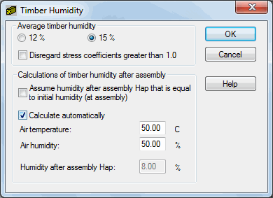 - Average timber humidity (reference humidity); select one of 2 values (12 or 15 %) which has effect on the method of calculating reduction coefficients of timber strength (for compression and bending): coef.humflex and coef.humcomp