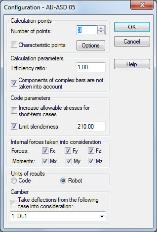 In the middle part of the dialog box, it is also possible to choose internal forces to be taken into account in member code calculations; switching on an option (e.g. Fx) results in the Fx force being considered in calculations. Moreover, units for presentation of results of the member design may be selected here. The results may be presented in the units used in the Japanese steel code, or in the units applied in the Robot program.