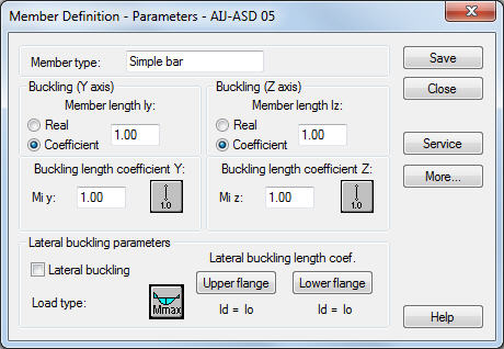 The Member type field is used to determine the name of a selected member type (any name of the member type may be typed here). The length of a member for the appropriate plane is defined in the Buckling (y axis) or Buckling (z axis) fields. There are two ways to determine this length