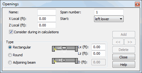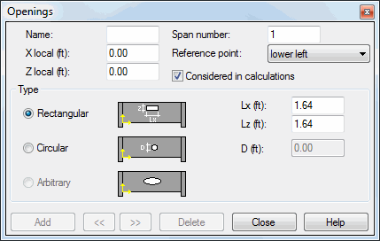 In the case of deep beams, the dialog box that allows one to define openings assumes the shape shown in the figure below: