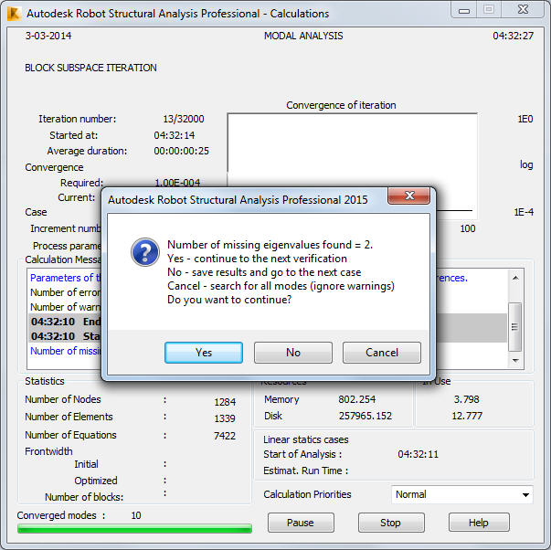 N is ignored. Computations continue until the current mass percent is not smaller than the demanded mass%, or the user is prompted to stop the computations, or the number of converged eigenpairs achieves the maximum available value. This value set is defined internally and it is 100 in the current version. After each 20 Lanczos steps, the number of the converged eigenpairs is recalculated and the current mass percentage is modified. A warning prompts the achieved mass percent. If instructed Yes, continue computations during the next 20 Lanczos steps and display this message again. If required mass percentage is not achieved (the number of converged eigenpairs does not exceed the maximum available value) No, save the converged eigenpairs as final results and pass them to the next case. Cancel, ignore all warnings in the future and continue computations. |