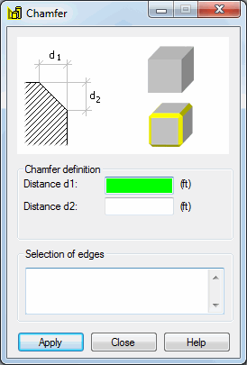 - In the Selection of edges field, specify (or highlight in the drawing area) edges (at least 2 edges) for which a chamfer is to be defined.