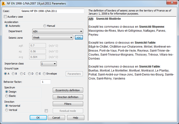 Seismic Analysis Parameters (French Code NF EN 1998-1/NA:2010p)