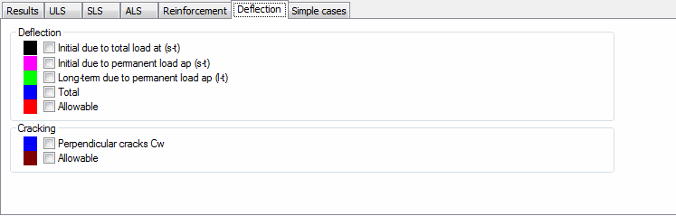 For the codes: EC2 - Belgium NAD, BS8110, PN-84/B-03264 and PN-B-03264 (1999), the dialog box presents two separate fields: Deflection and Cracking. The Deflection field provide access to options that enable displaying - on a diagram - allowable and total deflections as well as intermediate stages of deflections compatible with the required code calculations. The Cracking field allows displaying - on a diagram - element cracking and the limit value resulting from a code.