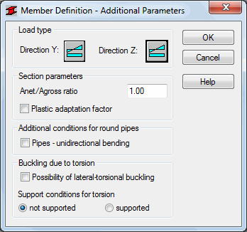 - Lateral torsional buckling; determine if such buckling type will be taken into consideration and what the conditions of support against torsion are to be (fixed or pinned member).