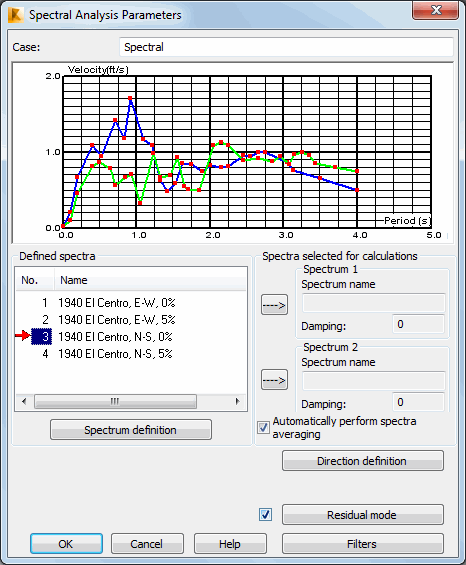 Structure spectral analysis will be performed for those displayed in the Spectra selected for calculations field. To choose a spectrum, select one of the spectra in the Defined spectra field and click the upper →. The spectrum and its damping value will be shown in the relevant fields. A diagram of the spectrum will display in the coordinate system.