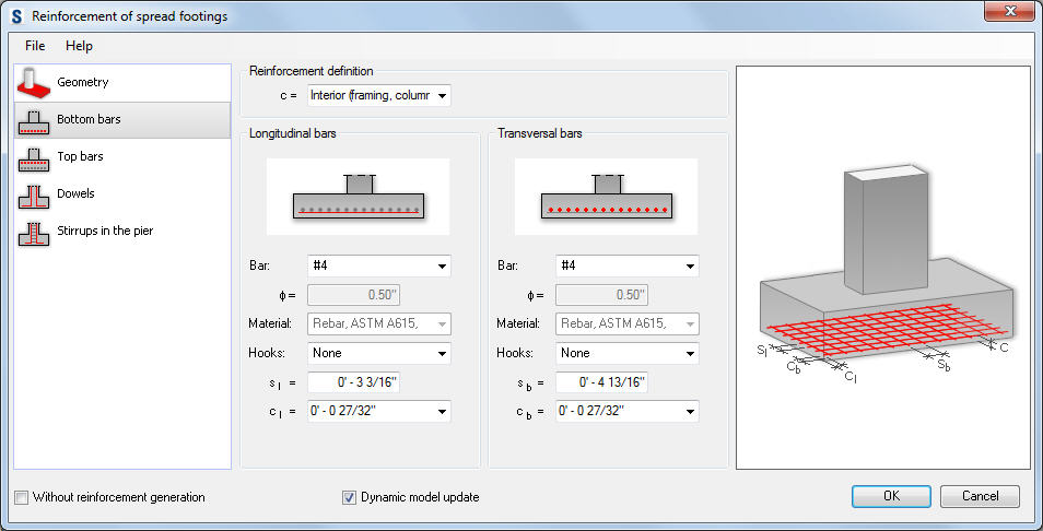 There are several parameters of bottom reinforcement defined in the Reinforcement of spread footing dialog: