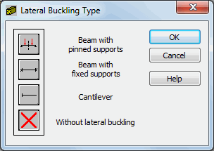 According to the code requirements, one of the models considered in the code must be accepted. The models are displayed as icons and represent the appropriate support positions from the code. Click the last icon to exclude the lateral buckling effects in the calculations.