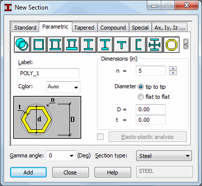 The Parametric tab on the New Section dialog lets you define or select sections created by users.