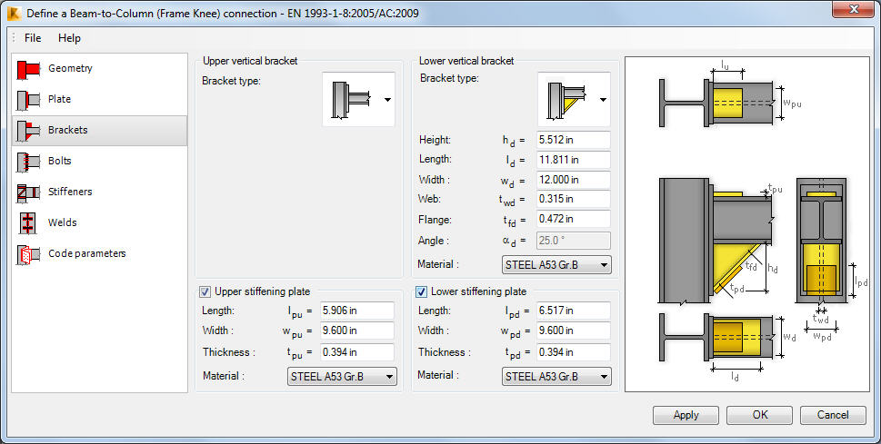 Use the Brackets tab to define different types of brackets between the beam flanges and the front plate.