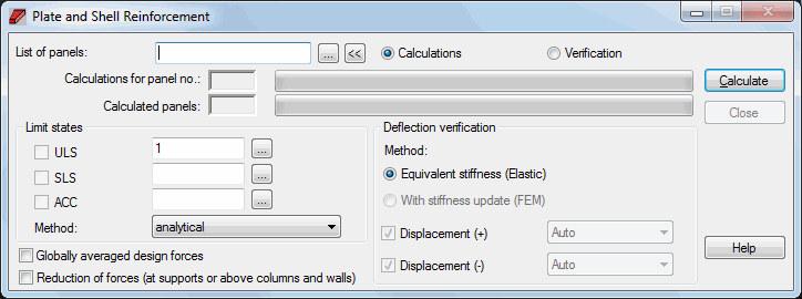 - Panel calculations are performed only for panels with numbers specified in the List of panels field and for cases or case combinations specified in the ULS, SLS, ACC fields.