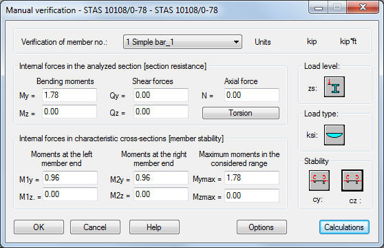 Note: In calculations run in the Manual verificationdialog box internal bracings defined in the Member definitiondialog box are not taken into account and a member is treated as the one without bracings over its length.