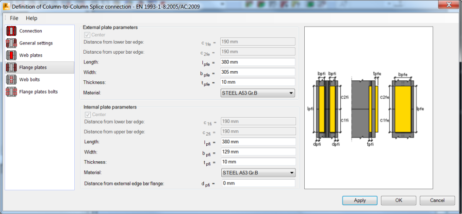 Note: If the connection is not symmetrical the Flange plates panel is divided in two panels: