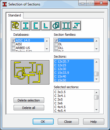 - Databases - displays all bar section folders available in the program; after selecting a database, families and bar sections are entered into the Section families and Sections fields