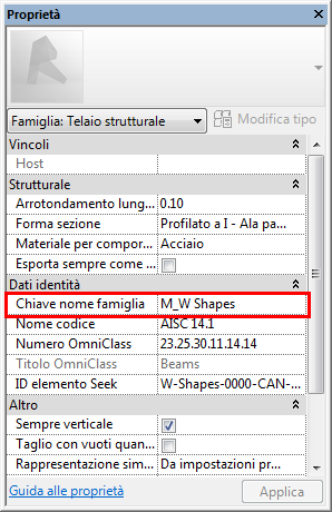 Il parametro Chiave nome famiglia viene mappato con un mappaggio 1 ad 1 al nome di tabella di Advance Steel. Questo parametro viene memorizzato nella famiglia.