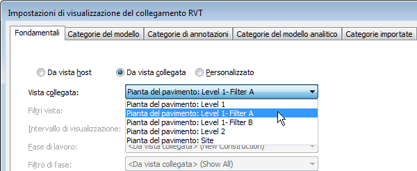 - Nella finestra di dialogo Impostazioni di visualizzazione del collegamento RVT, nella scheda Fondamentali, effettuare le seguenti operazioni: