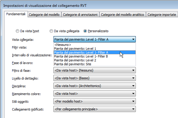 - Da vista collegata. Visualizza il modello collegato utilizzando le impostazioni grafiche e di visibilità della vista collegata specificata.