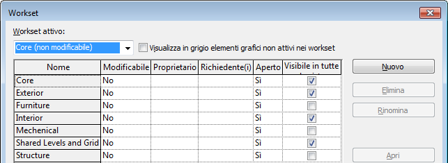 Questa impostazione globale definisce il comportamento di default di ciascun workset nelle viste di progetto. È possibile modificare la visibilità di un workset in una o più viste specifiche.