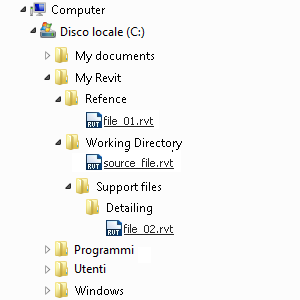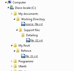 Tutti i percorsi assoluti originali sono ora non risolti poiché puntano ad una posizione specifica. Il percorso relativo al file file_01.rvt è altresì interrotto, poiché originariamente collocato al di fuori della directory di lavoro e, pertanto, non spostato insieme ad essa.