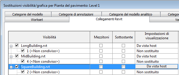 I parametri che controllano la visibilità e gli elementi grafici dei modelli Revit collegati sono raggruppati nella scheda Collegamenti Revit della finestra di dialogo Visibilità/Grafica.