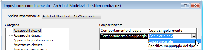 Per ogni tipo di impianto nella categoria, è possibile selezionare Copia tipo originale, Non copiare il tipo oppure un tipo di famiglia caricato nel modello. Tali mappaggi del tipo vengono utilizzati quando gli impianti vengono copiati nel modello.
