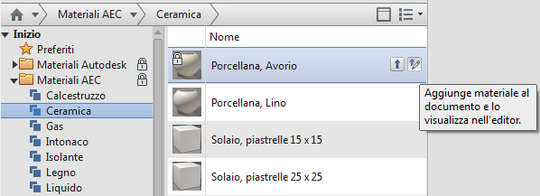 • Nell'elenco dei materiali della libreria, fare clic su un materiale, quindi fare clic sul pulsante Aggiungi/Modifica , che consente di aggiungere il materiale all'elenco dei materiali del progetto.
