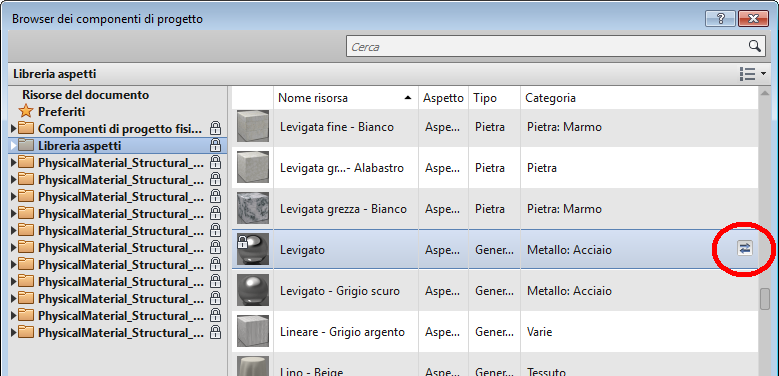 È possibile sostituire un componente esistente con un altro selezionato nel Browser dei componenti di progetto. Il materiale acquisisce le proprietà del nuovo componente di progetto.