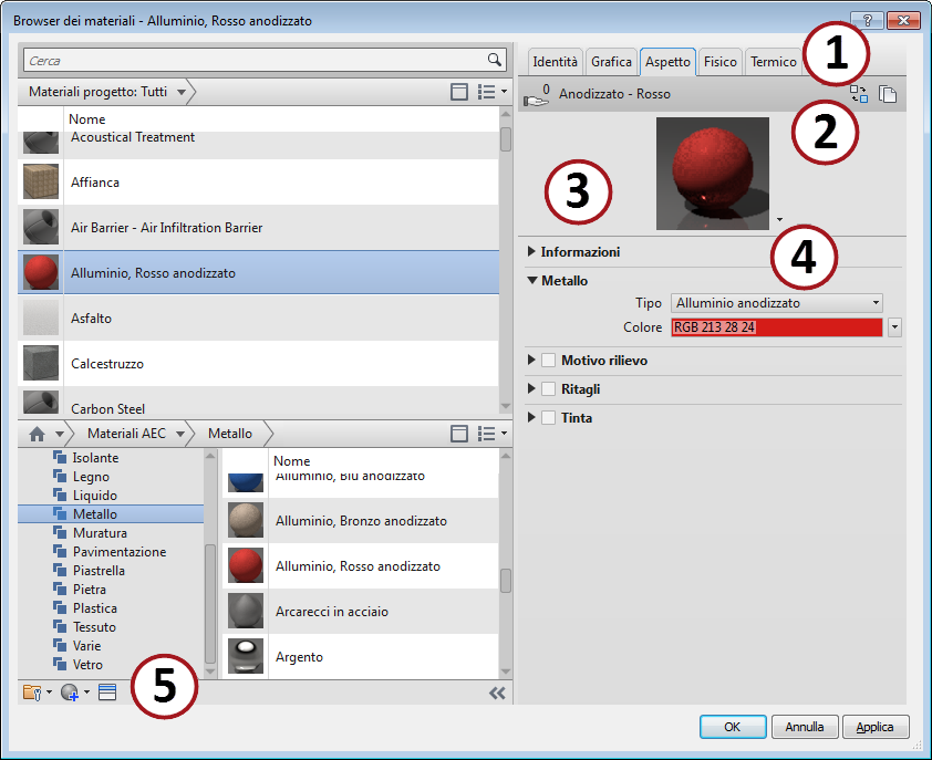 | 4 | Riquadro Proprietà: consente di visualizzare e gestire le proprietà dettagliate del componente di progetto selezionato. Il nome e la descrizione del componente di progetto sono disponibili al di sotto del riquadro delle informazioni. L'esempio visualizzato sopra mostra le proprietà Metallo espanse per il componente di progetto Anodizzato - Rosso. |