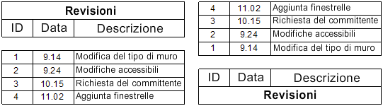 Le informazioni contenute negli abachi delle revisioni possono essere visualizzate in vari modi. Alcuni studi di progettazione preferiscono la disposizione dall'alto verso il basso con le intestazioni delle colonne e le righe di revisione a partire dalla parte superiore dell'abaco, altri invece preferiscono la disposizione dal basso verso l'alto con le intestazioni delle colonne e le righe di revisione a partire dalla parte inferiore dell'abaco. In entrambi i casi, le righe dell'abaco delle revisioni vengono ordinate in base alle impostazioni specificate nella scheda Ordinamento/Raggruppamento della finestra di dialogo Proprietà revisione.