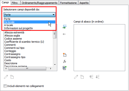 - Nella scheda Campi, dal menu a discesa Selezionare campi disponibili da, scegliere Da locale o A locale.