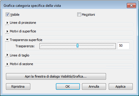 Per elemento. Viene visualizzata la finestra di dialogo Grafica elemento specifica della vista che elenca le impostazioni di visibilità e visualizzazione grafica correnti dell'elemento. È possibile che sia necessario espandere le categorie per visualizzare i dettagli relativi alle impostazioni.