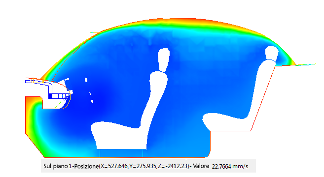 11. Eseguire l'indagine posizionando il puntatore del mouse sul piano. Controllare i valori di temperatura nella barra di stato in corrispondenza della parte inferiore sinistra dell'interfaccia. Indagare in prossimità di piedi, ginocchia, fianchi e teste degli occupanti dei posti anteriori e posteriori.