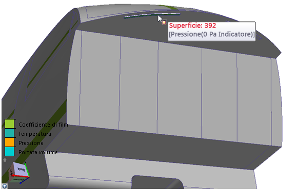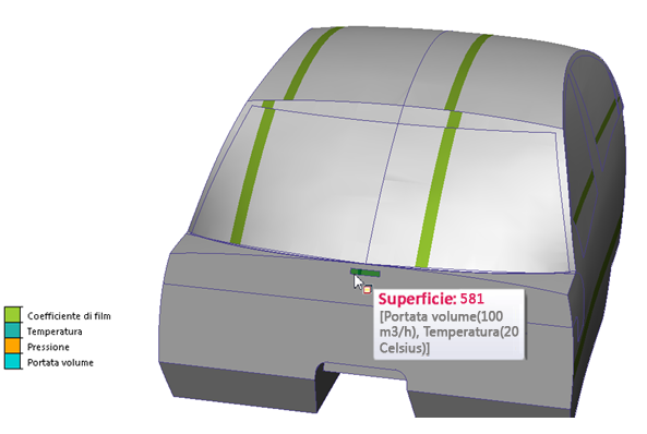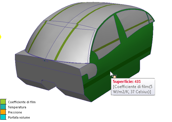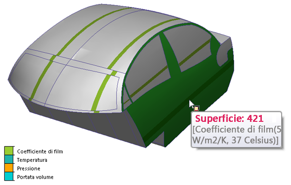 13. Per simulare un veicolo fermo in condizioni di caldo, applicare un coefficiente di film ai lati e alla parte superiore del cabina passeggero. Selezionare le seguenti superfici e fare clic sul pulsante Modifica nella barra degli strumenti contestuale: