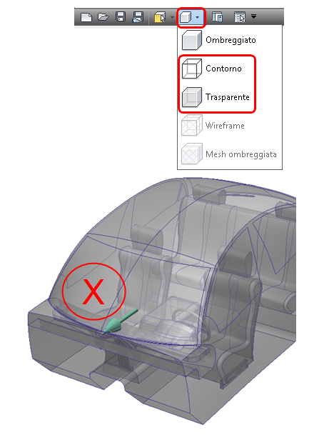 10. Per accertarsi che la direzione del flusso sia corretta, visualizzare il modello come Contorno o Trasparente dalla barra degli strumenti Accesso rapido. Osservare la freccia di direzione del flusso. Se non è corretta, fare clic su Inverti perpendicolare nella linea Direzione della finestra di dialogo Condizioni al contorno. Fare clic su Applica.
