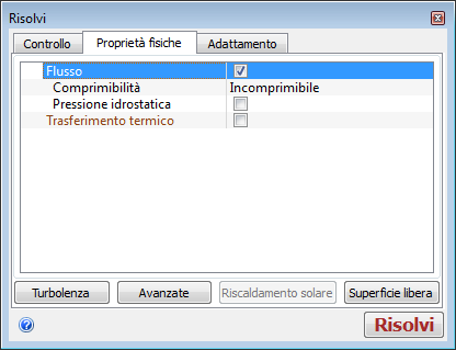 Le impostazioni di default definiscono un'analisi del flusso turbolenta, non comprimibile e senza alcun trasferimento termico. I parametri indicano i dati di progettazione naturali e vengono elencati di seguito: