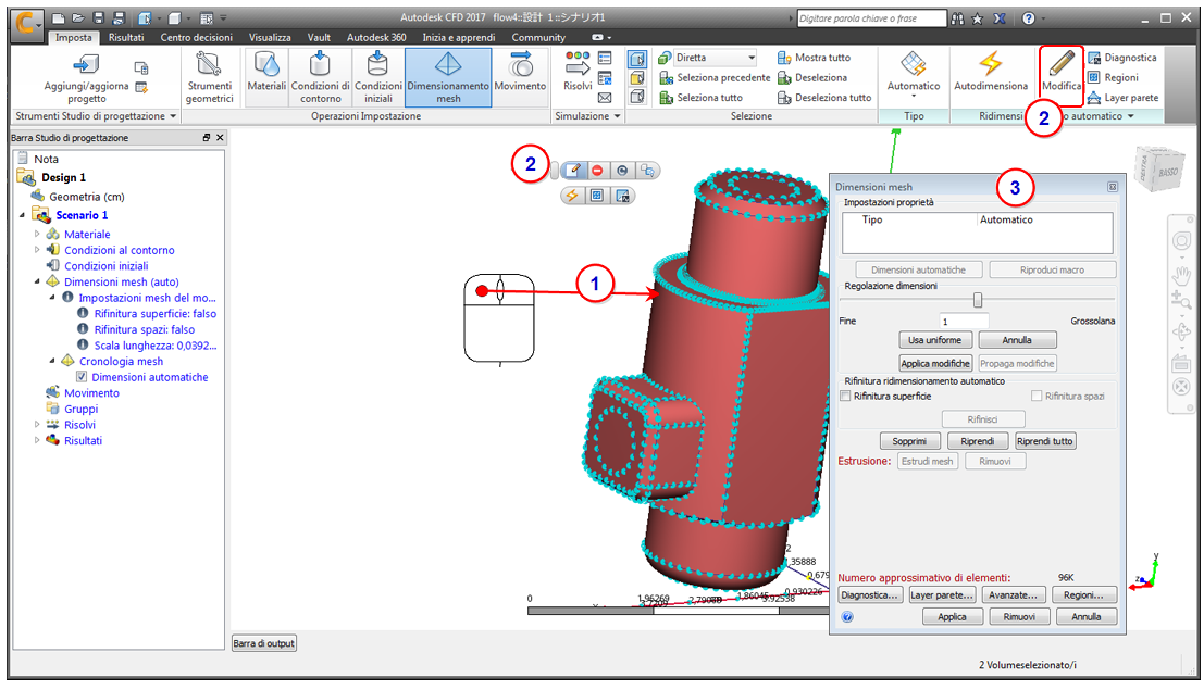 Utilizzare gli strumenti mesh per personalizzare la distribuzione della mesh. Tutti gli strumenti sono accessibili dalla finestra di dialogo di modifica rapida Dimensioni mesh. Per semplificare il flusso di lavoro, molti sono disponibili anche nella barra del menu contestuale e nel quadro contestuale.
