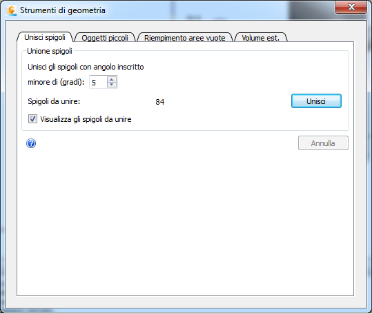 Unione spigoli unifica gli spigoli che si incontrano in corrispondenza di un vertice comune con un angolo di inflessione minore di una tolleranza specificata. Questo strumento fornisce il vantaggio di ridurre il numero di spigoli, soprattutto quelli piccoli, permettendo di ridurre la densità generale della mesh e offrendo tempi di analisi più rapidi.
