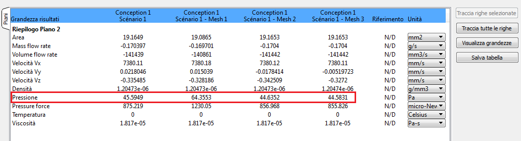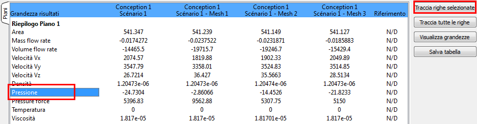 Per tracciare la pressione dalle quattro mesh, fare clic su Pressione, quindi fare clic sul pulsante Traccia righe selezionate: