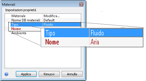 4. Nella finestra di modifica rapida Materiali, verificare che l'opzione Tipo sia impostata su Fluidoe Nome su Aria.