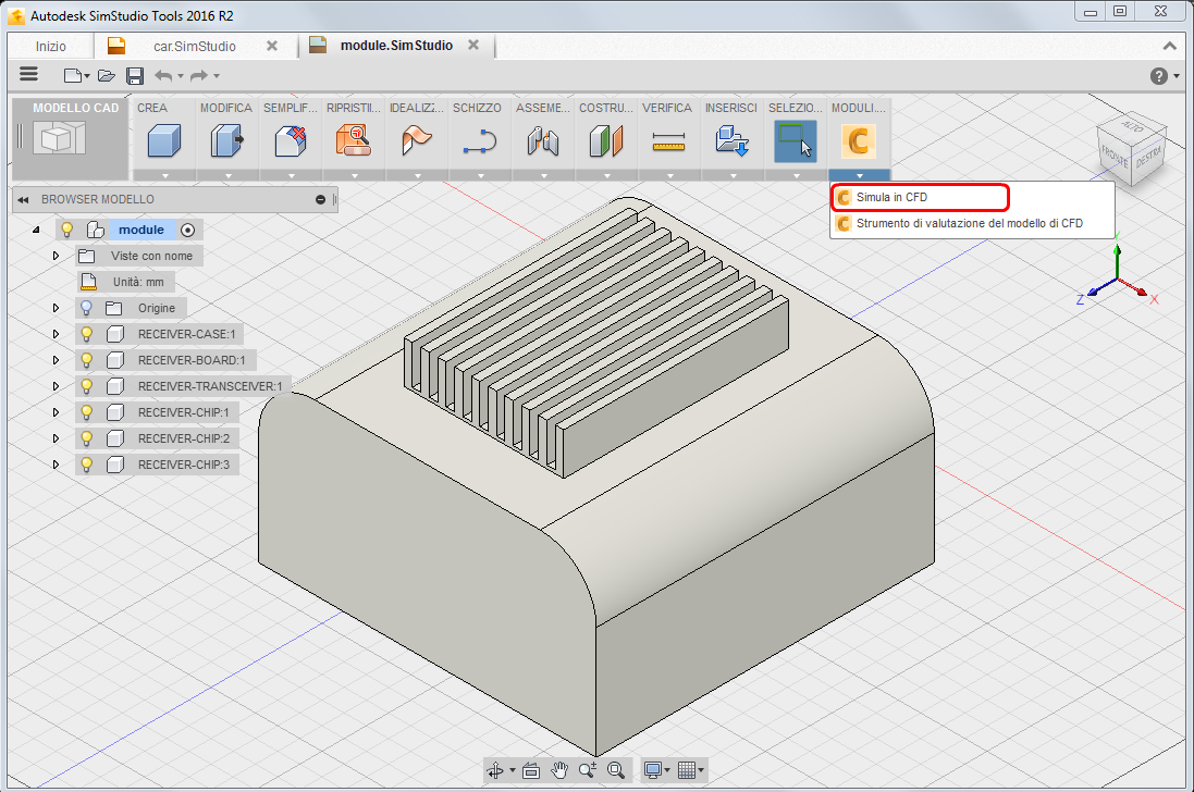Espandere il menu Moduli aggiuntivi e selezionare Simulate in CFD.