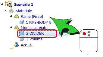 Fare clic con il pulsante sinistro del mouse sulla parte Volume e trascinarla sul materiale Acqua.