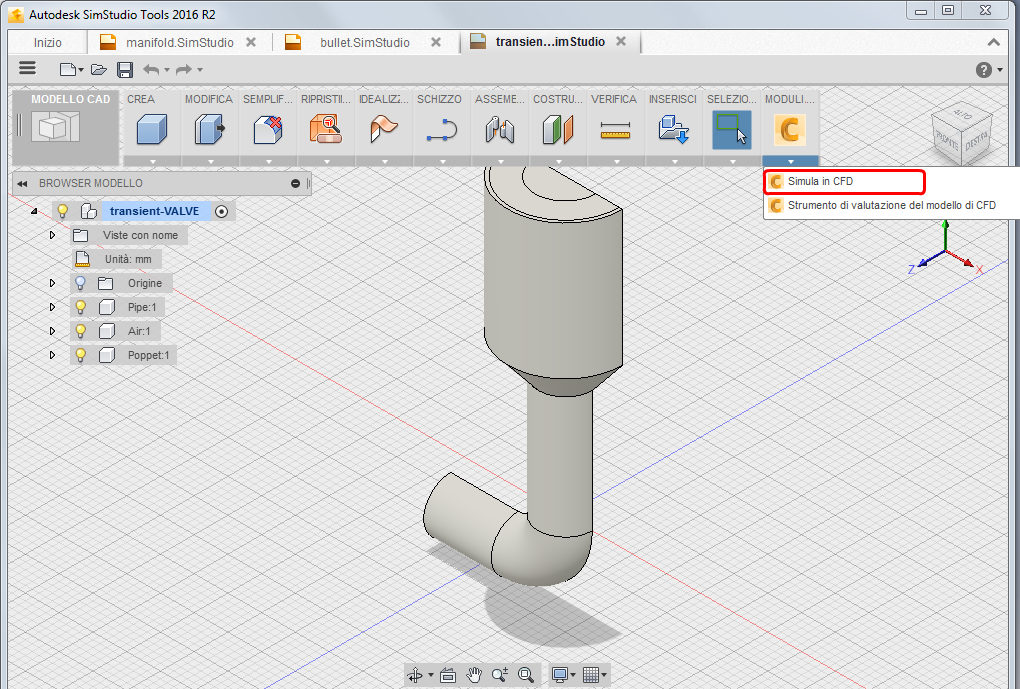 Espandere il menu Moduli aggiuntivi e selezionare Simulate in CFD.