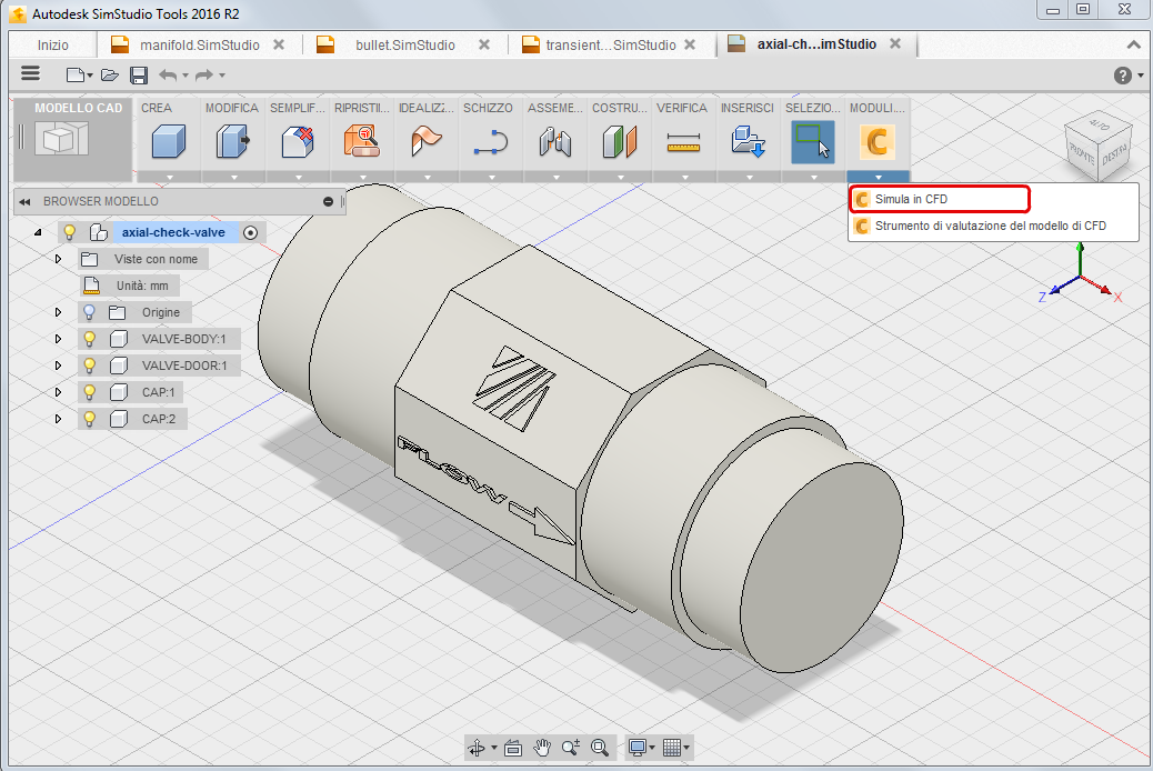 Espandere il menu Moduli aggiuntivi e selezionare Simulate in CFD.