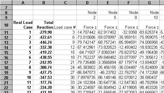 11. The case number and support reaction at the individual nodes are not of interest in this case. So insert two columns into the spreadsheet. In the first column, add a formula for the real load case which equals the file's load case divided by 3 (formula in cell A11 = C11/3, copied down the 20 rows). In the second column, add a formula that sums the values for all the nodes on the row (formula in cell B11 = sum(D11:J11) if there are 7 nodes with supports).