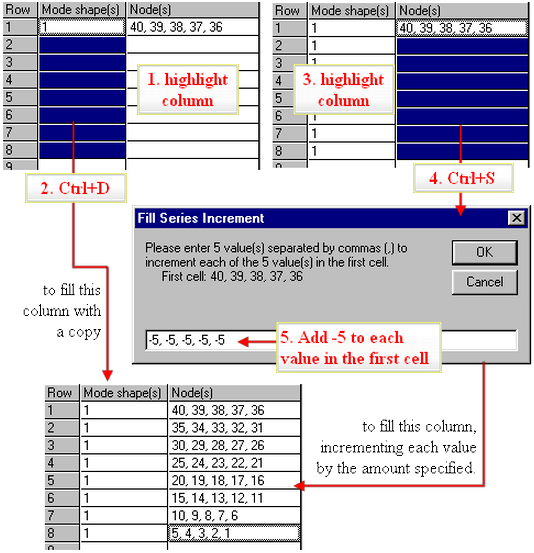 Reverse the Results: Imagine that for whatever reason, you want to have the results for a 40 node model output in reverse order, from the last node to the first node. The Load case spreadsheet is the obvious way to accomplish this. Unfortunately, the nodes cannot be specified as 40-1; the Nodal Results Translator automatically reverses the node order to be in ascending order (nodes 1-40) when the Create File button is clicked. Instead, enter the first row of data, and then use the hot keys to fill in the load case spreadsheet using the 5 steps shown in the figure. To make the grid easier to read (and easier to type), enter the first 5 node numbers on the first row, in reverse order of course.